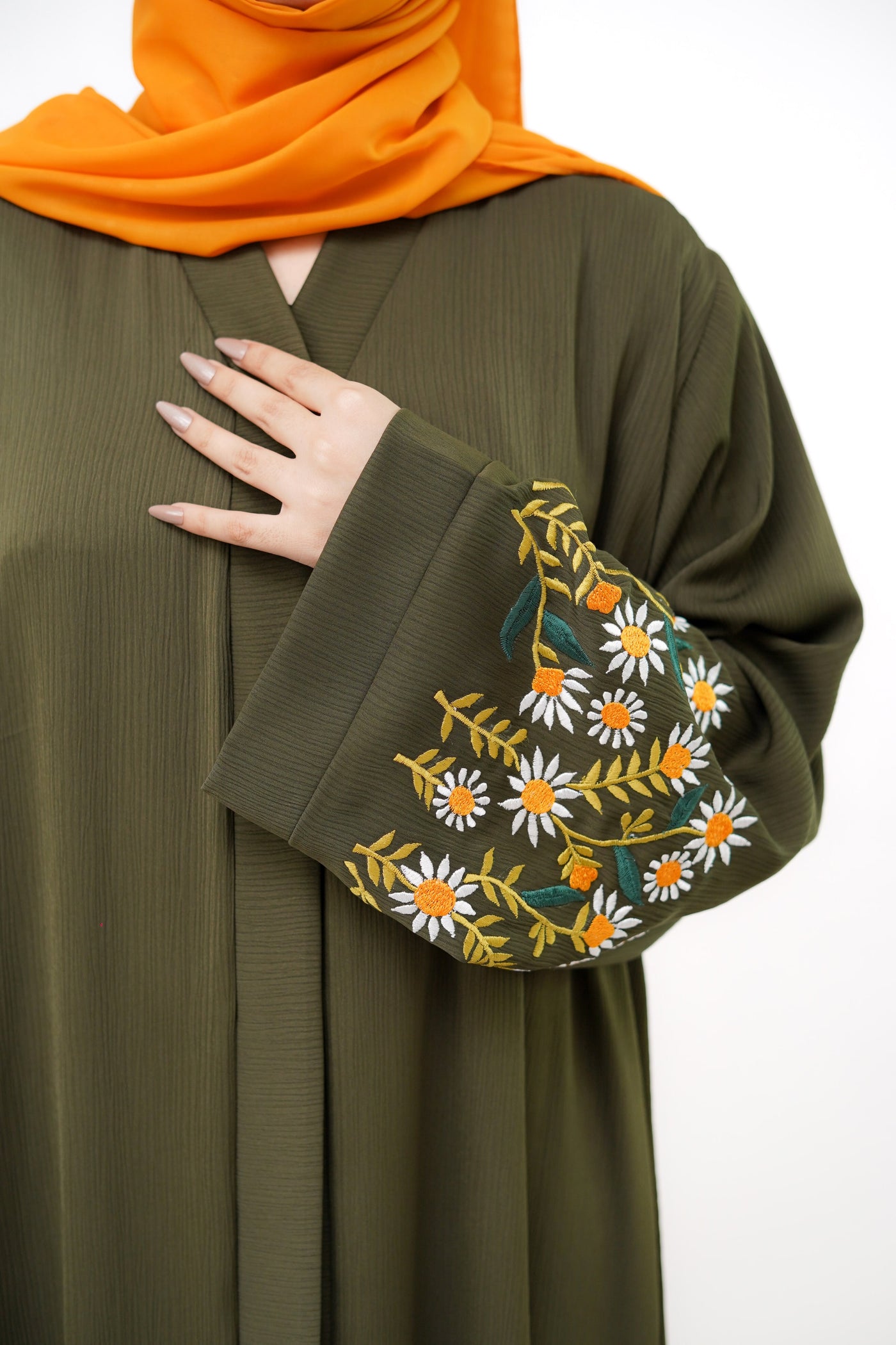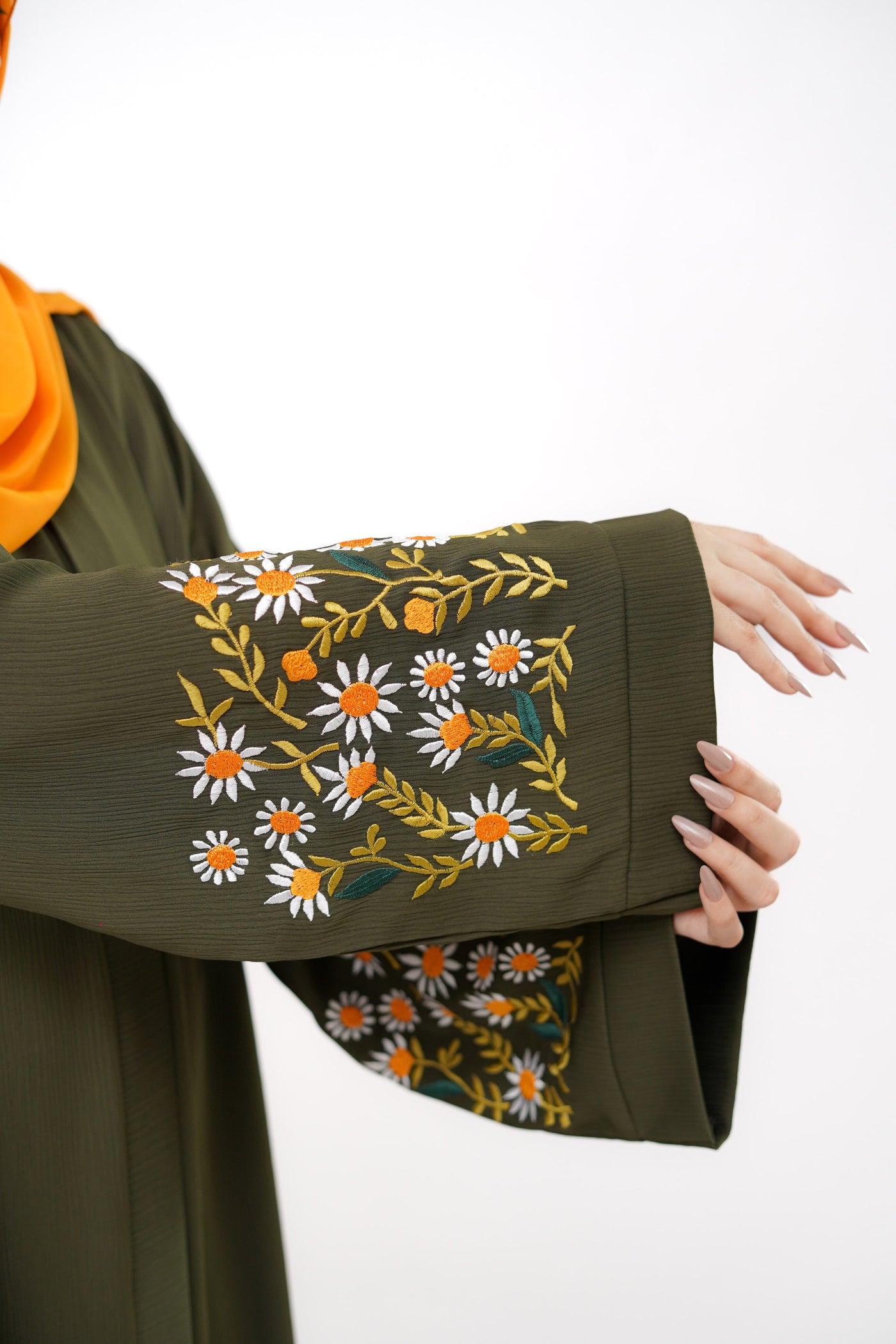 Step into timeless elegance with Lunara Olive, crafted from luxurious Zoom Nida fabric for a flowy, refined drape. This front-open abaya showcases intricate sunflower and daisy-inspired embroidery on the sleeves, blending earthy olive tones with a pop of sunshine from its mustard yellow contrast dupatta. Designed for the woman who loves sophistication with a touch of nature’s charm, Lunara Olive is your go-to piece for both everyday elegance and special gatherings.