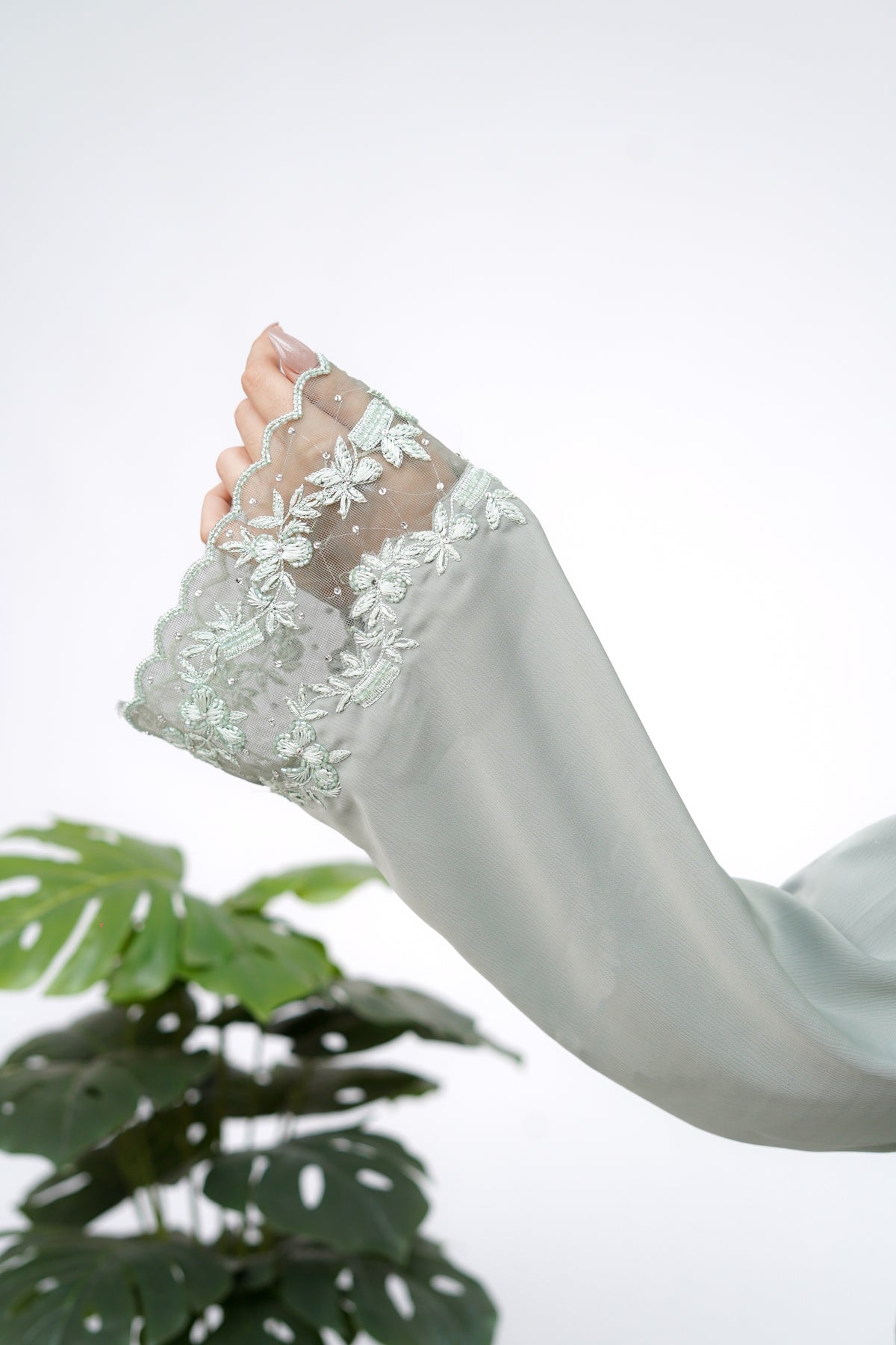Details: Hand-embroidered floral lace sleeves with crystal embellishments