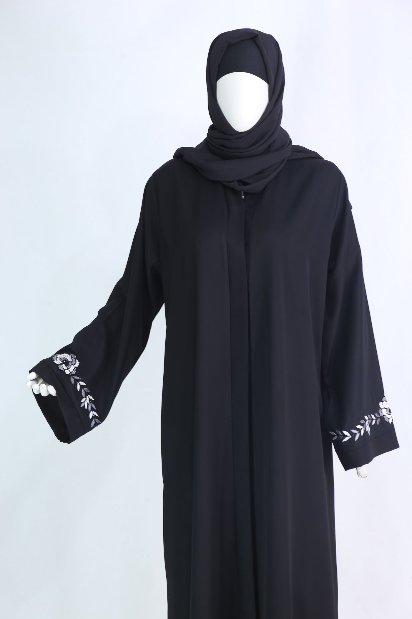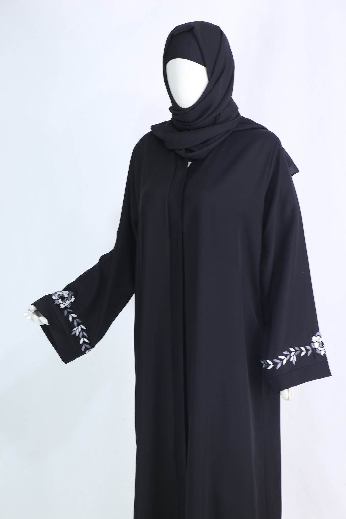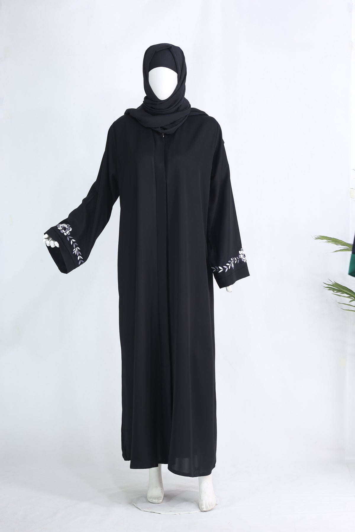 Made from premium, flowy fabric, it drapes beautifully and feels incredibly smooth and comfortable, giving you that perfect all-day ease. The highlight of this abaya is the intricate rose-inspired embroidery on the sleeves. The soft floral details add a gentle feminine touch that elevates the entire look without overwhelming its simplicity.