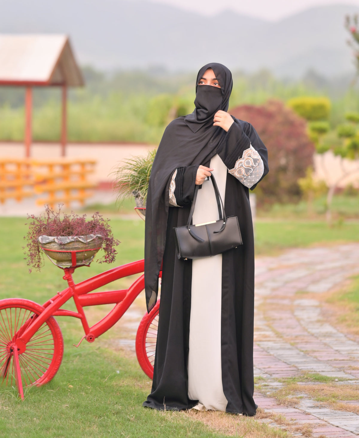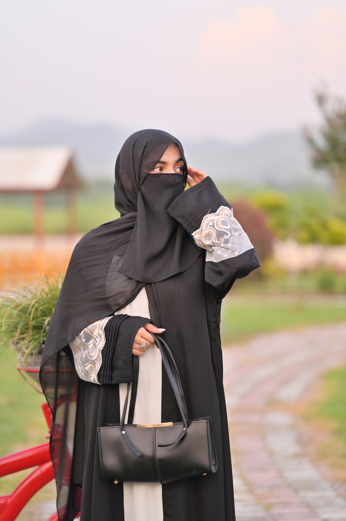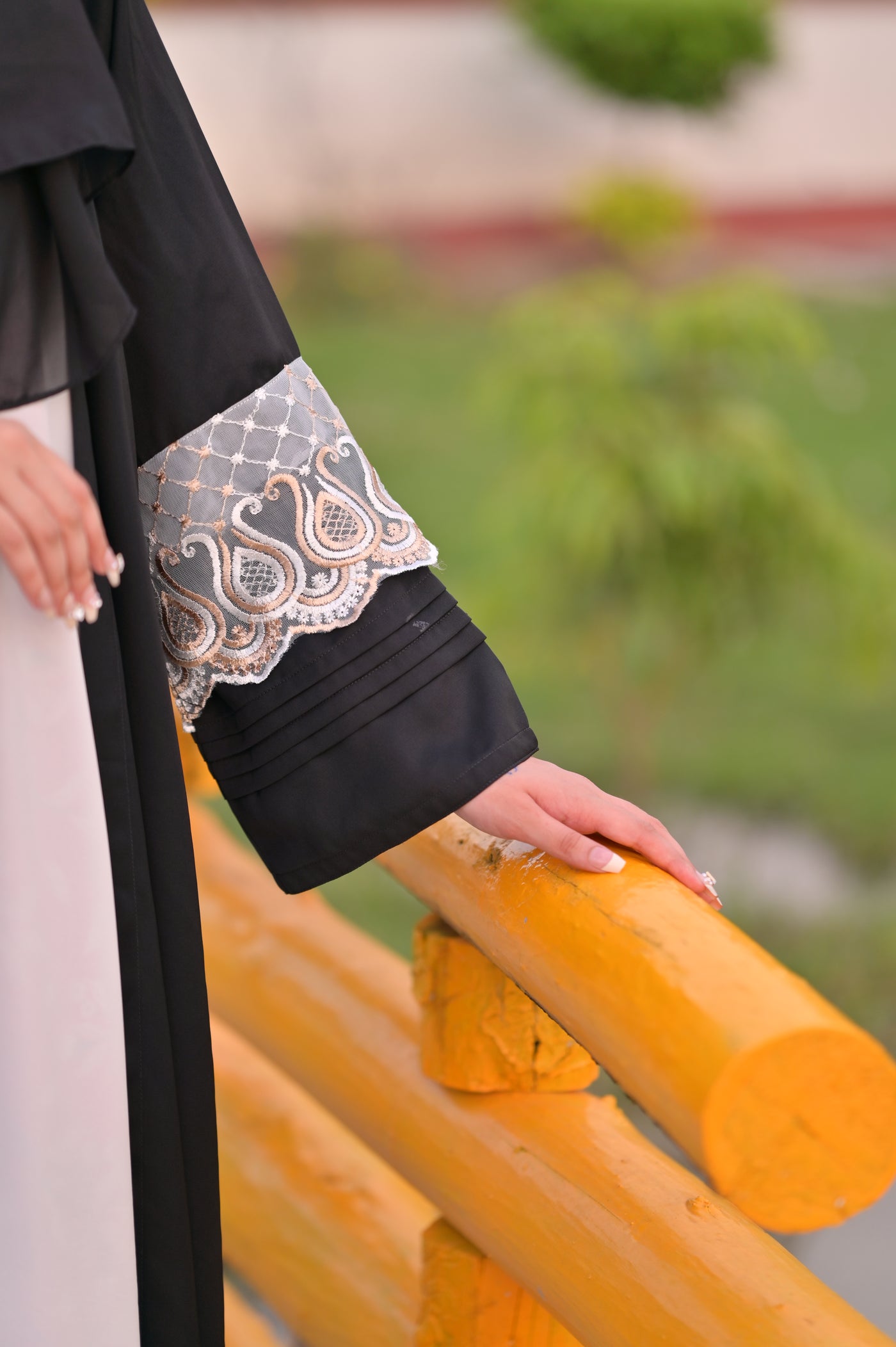 Introducing Tanzeela-B , The perfect addition to your wardrobe. Made with excellent quality Nida fabric and expert stitching, this Abaya boasts beautiful sleeves with lace details in a Black and white combination. And as a bonus, you'll receive a free scarf with your purchase. Elevate your style with Tanzeela-B.