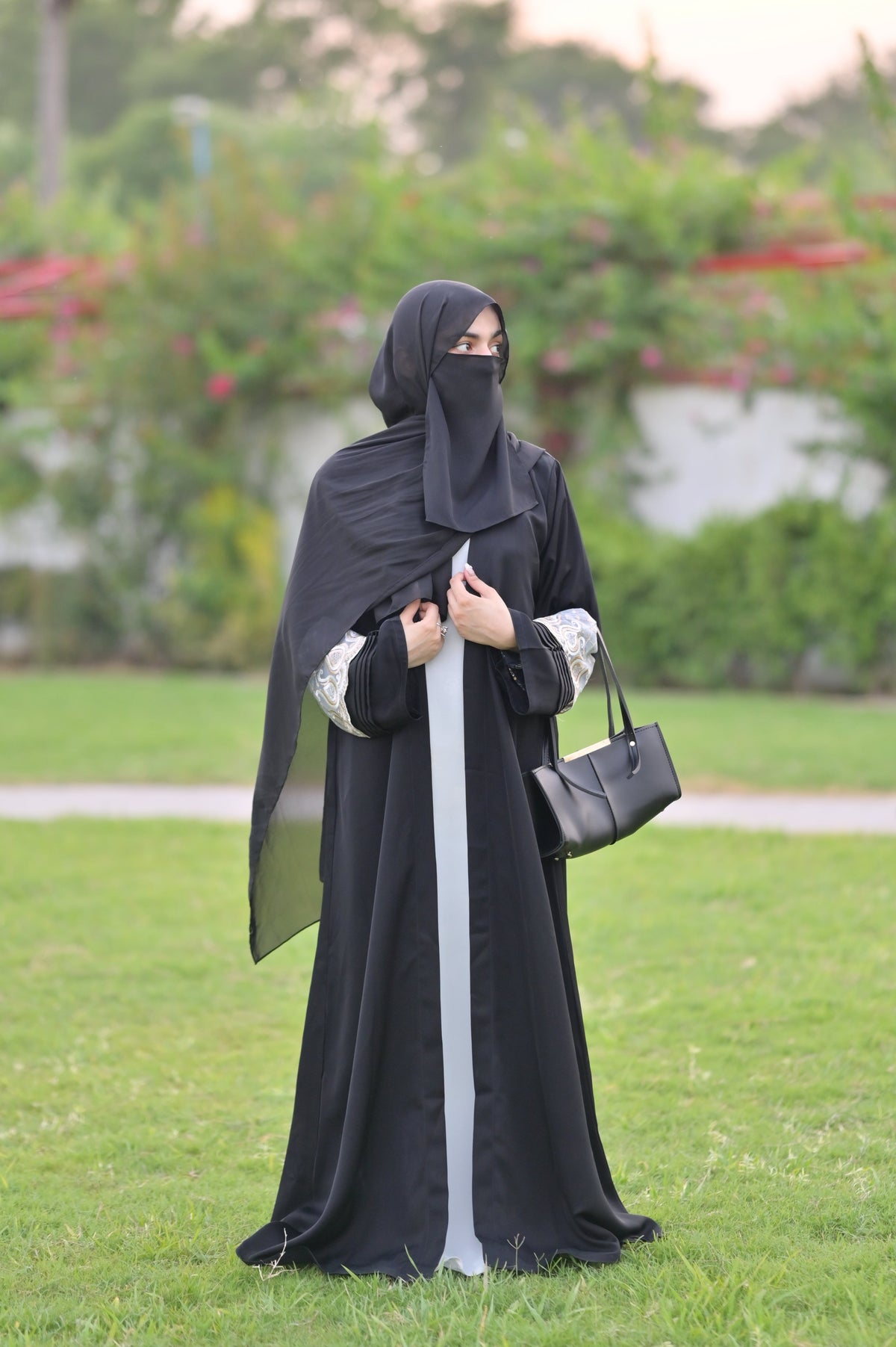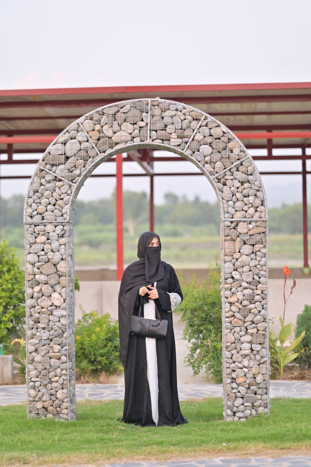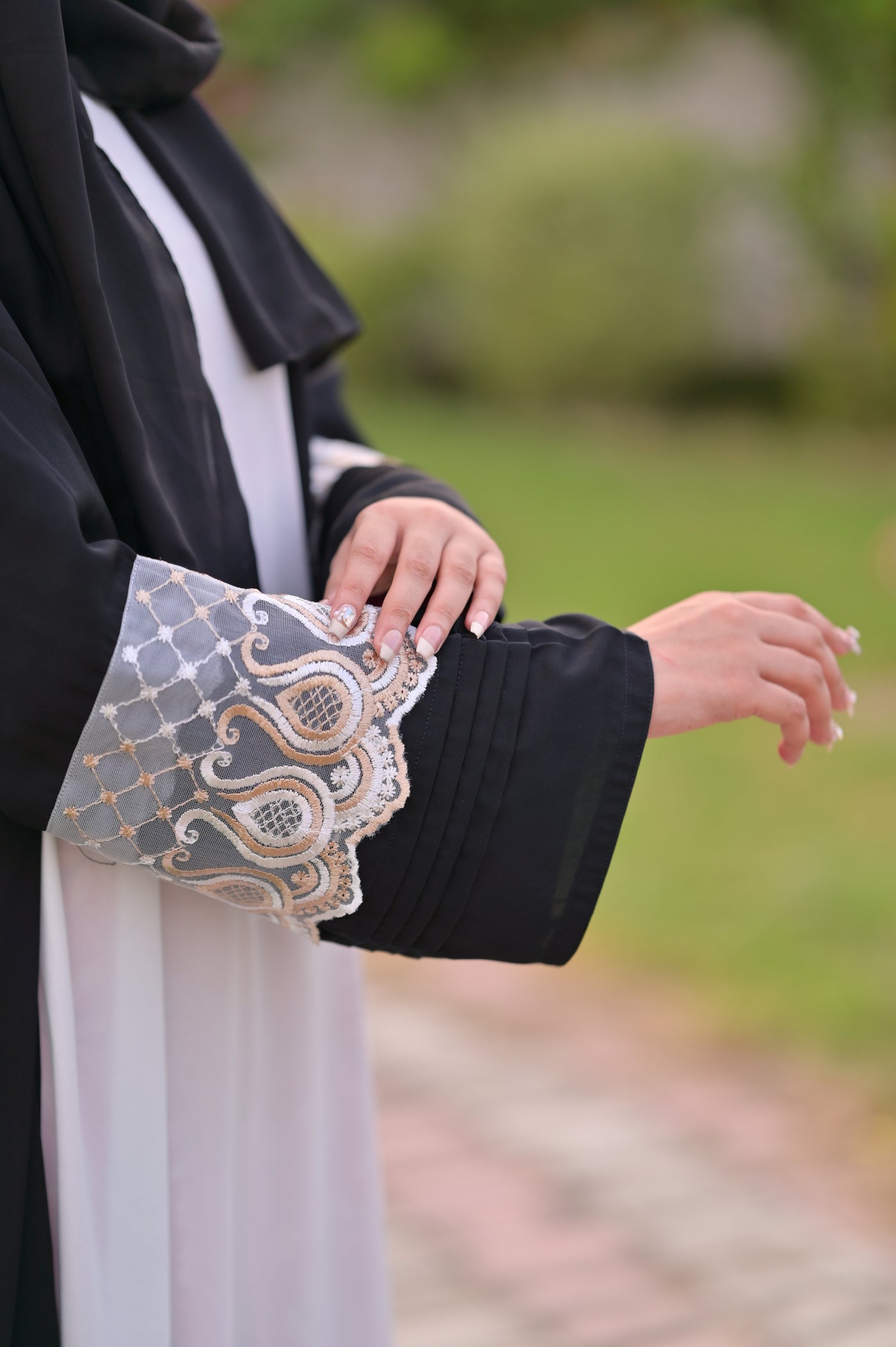 Introducing Tanzeela-B , The perfect addition to your wardrobe. Made with excellent quality Nida fabric and expert stitching, this Abaya boasts beautiful sleeves with lace details in a Black and white combination. And as a bonus, you'll receive a free scarf with your purchase. Elevate your style with Tanzeela-B.