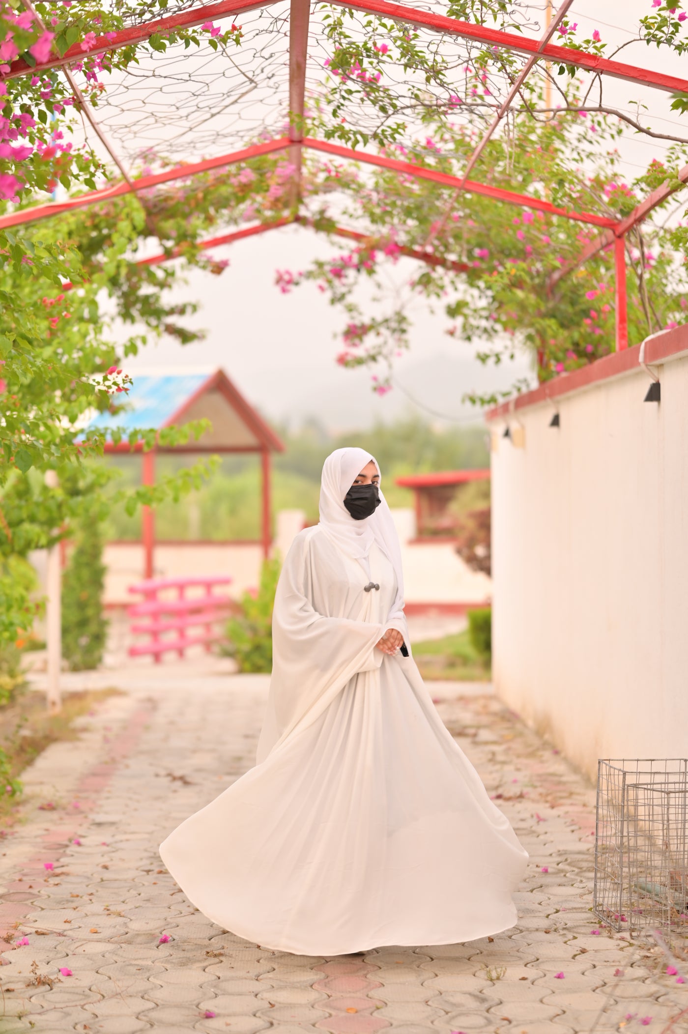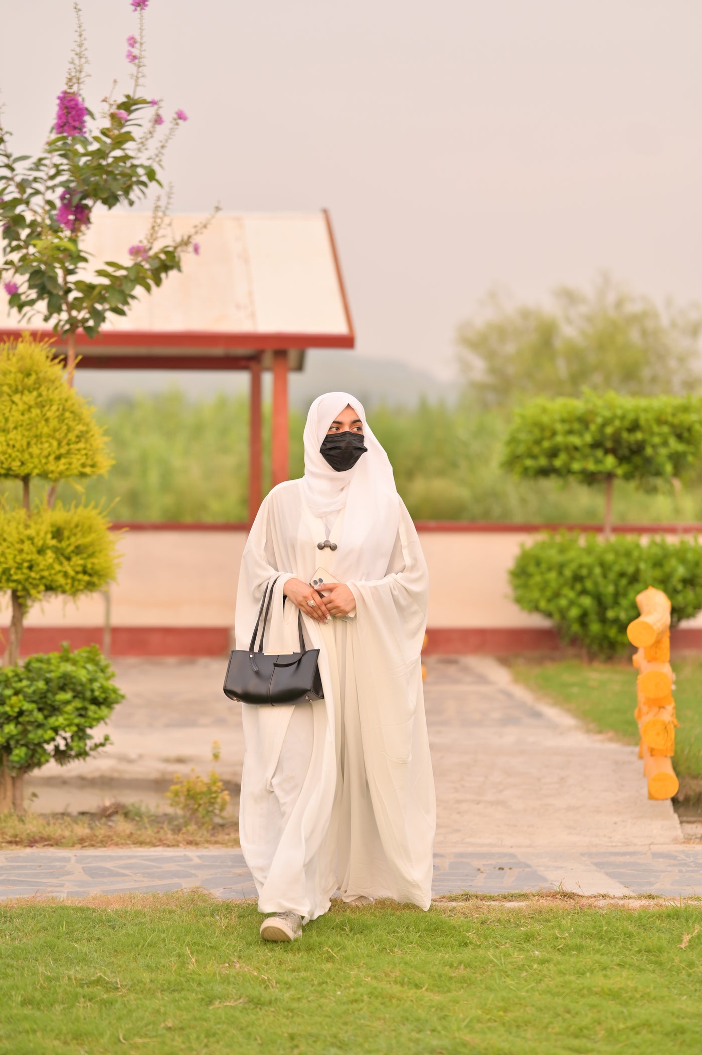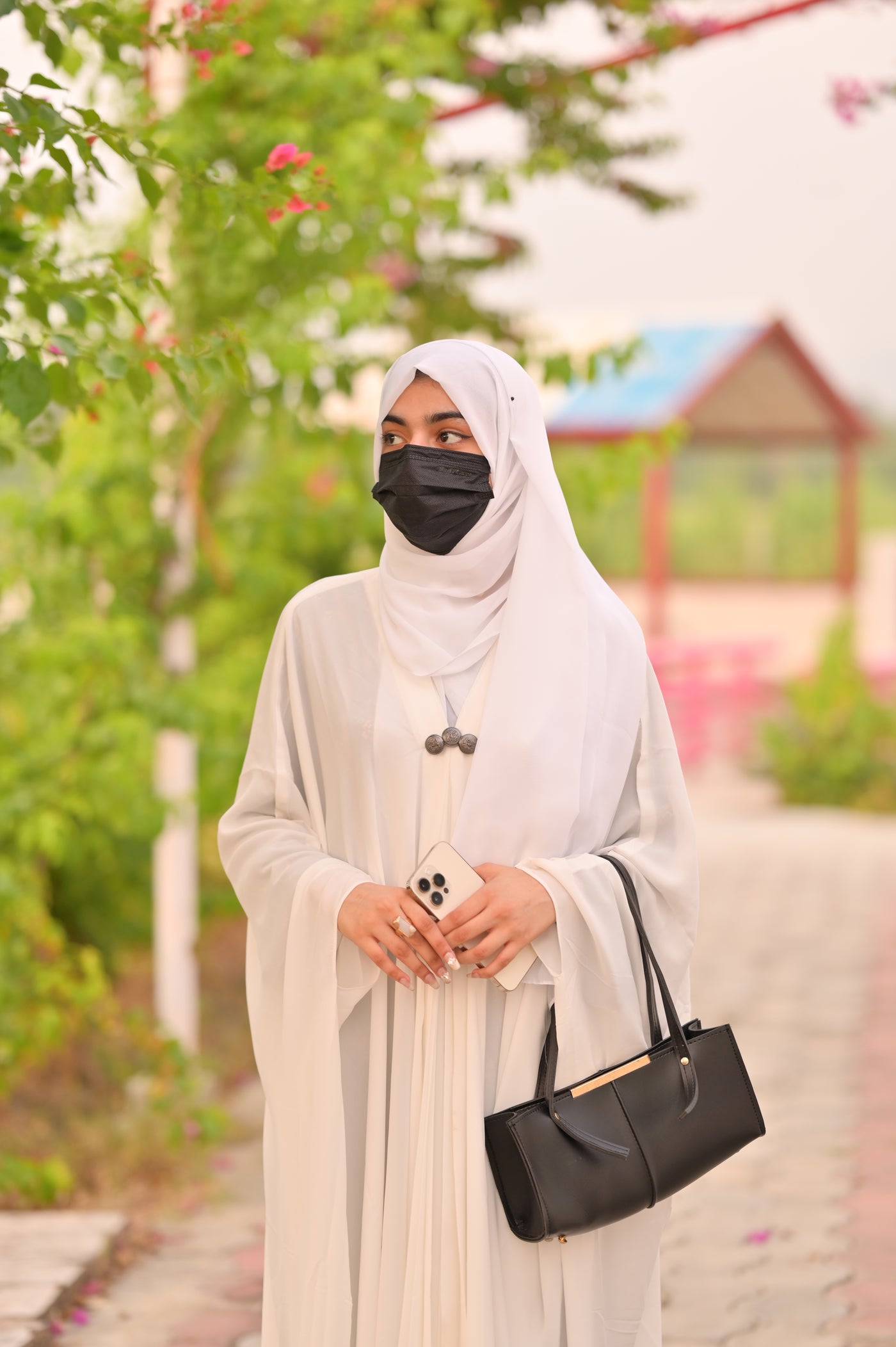 Introducing the Grace White Abaya, the perfect choice for casual wear with a touch of semi-formal elegance. Made from high-quality Manjan Georgette fabric, this abaya features a chic 3 button design for a sophisticated look. Elevate your style game with this must-have option in a gorgeous pearl white color.