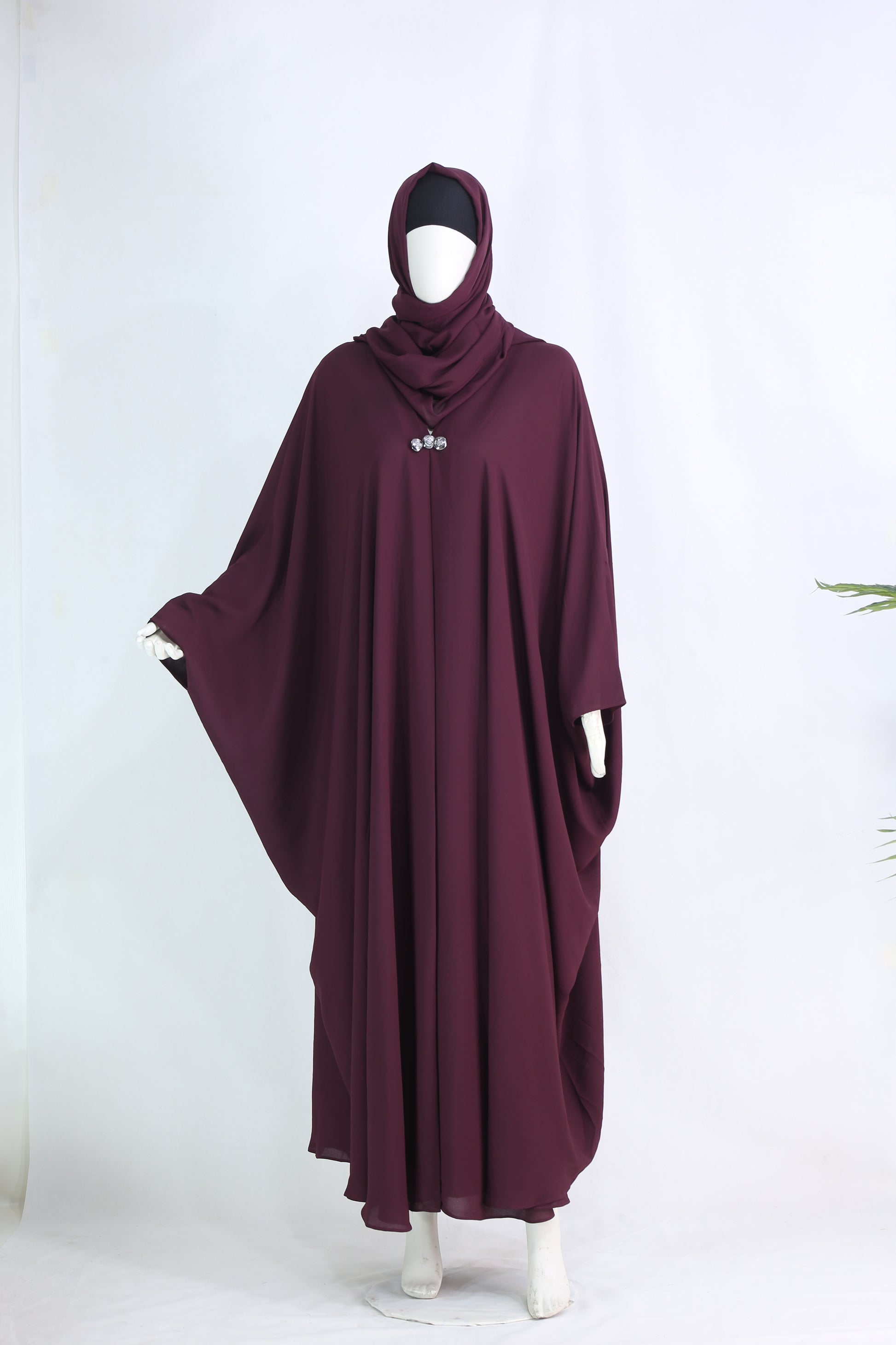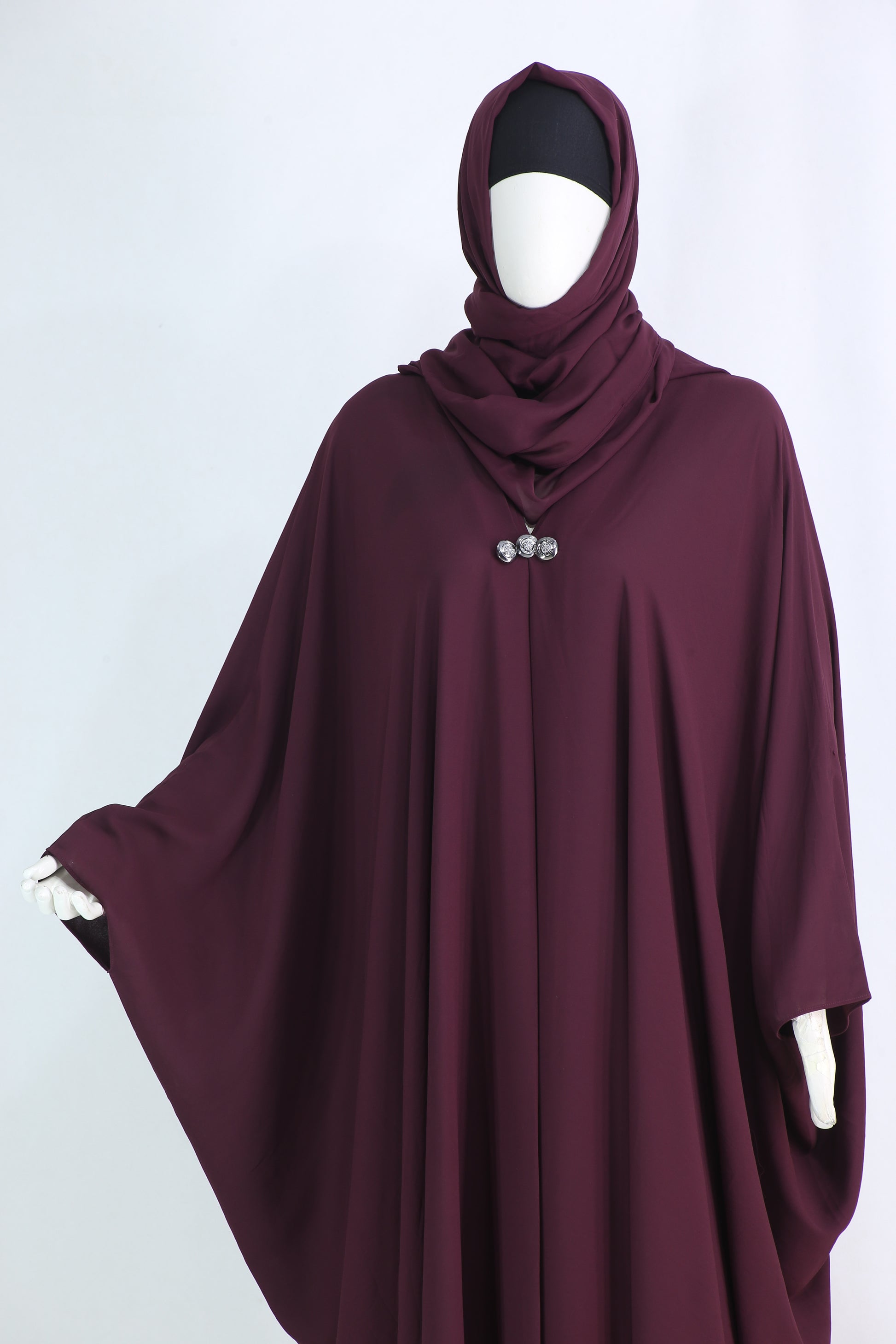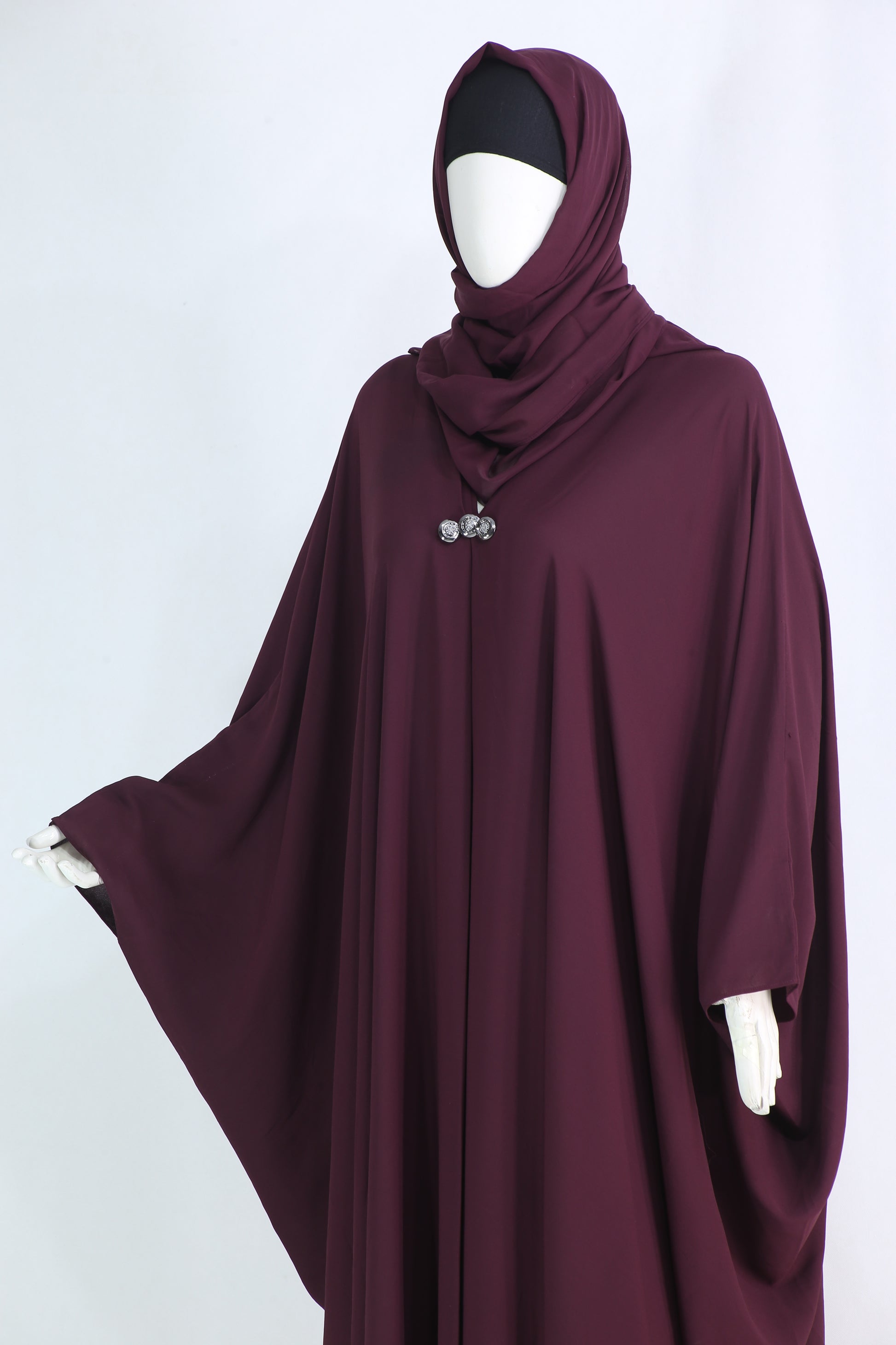 Designed in a poncho-style butterfly cut, this abaya drapes gracefully, making it ideal for both daily wear and formal occasions. The front-closed design with three crystal buttons adds a refined sparkle that enhances its luxurious appeal.