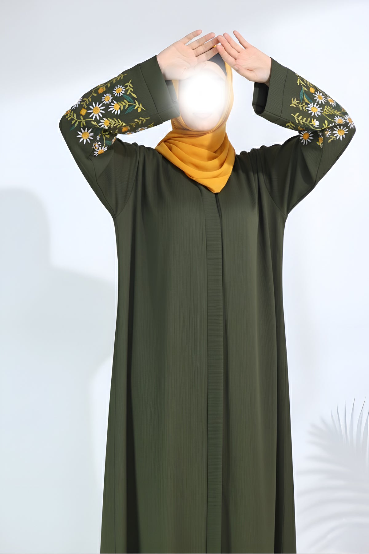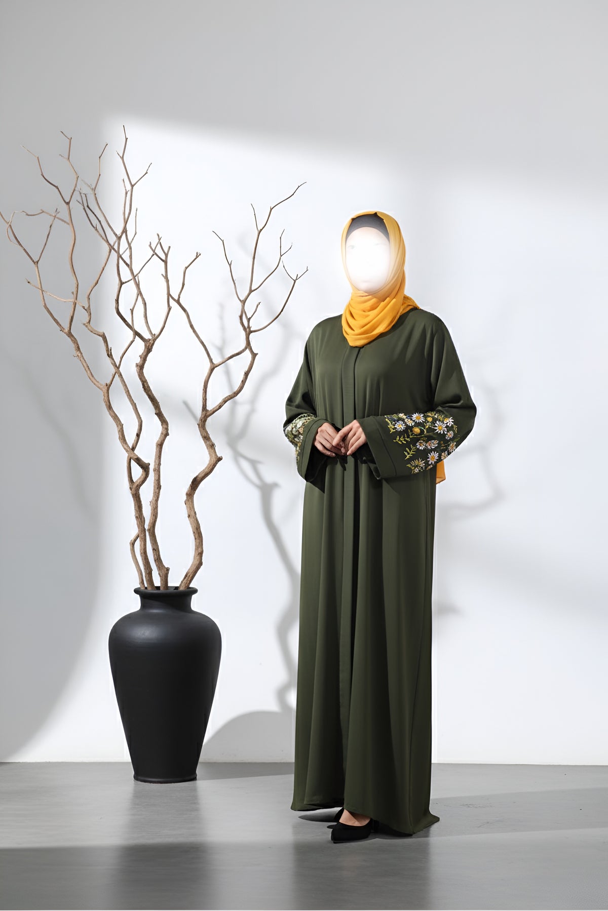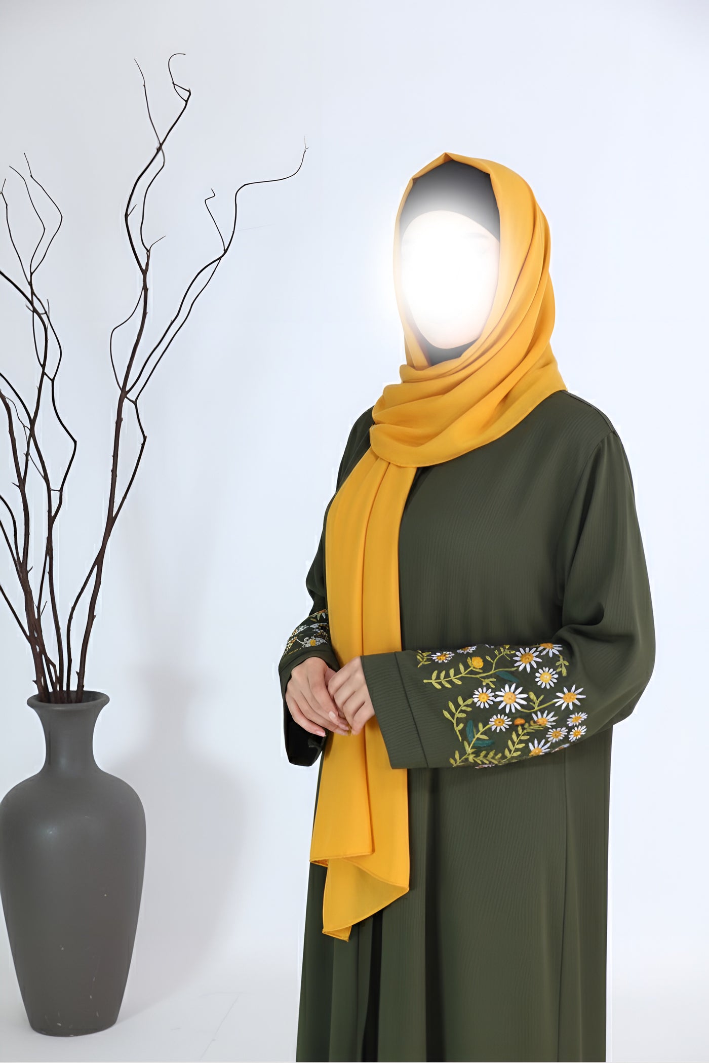 Step into timeless elegance with Lunara Olive, crafted from luxurious Zoom Nida fabric for a flowy, refined drape. This front-open abaya showcases intricate sunflower and daisy-inspired embroidery on the sleeves, blending earthy olive tones with a pop of sunshine from its mustard yellow contrast dupatta. Designed for the woman who loves sophistication with a touch of nature’s charm, Lunara Olive is your go-to piece for both everyday elegance and special gatherings.