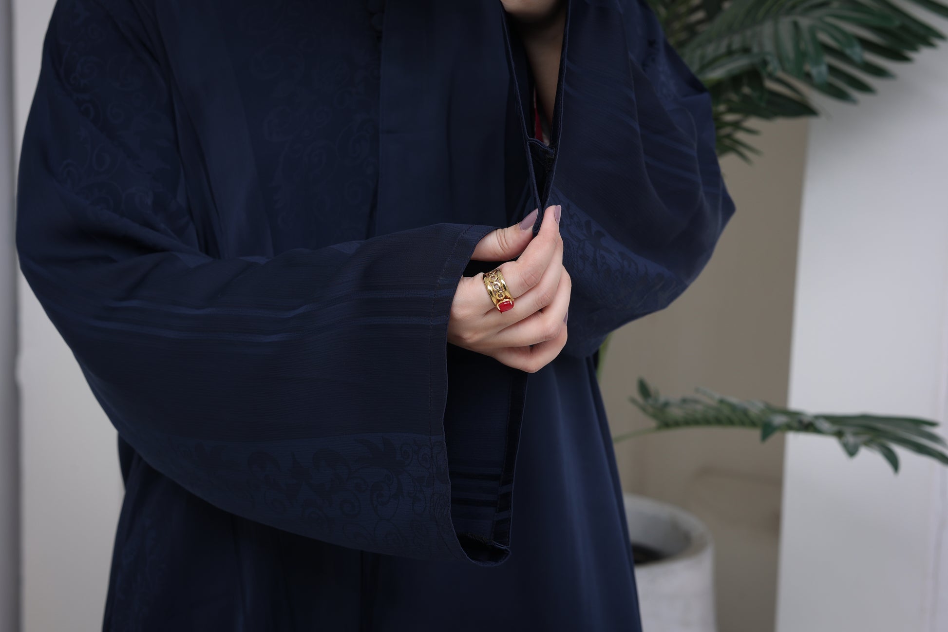 The highlight of this design is the beautifully arranged series of fabric-covered buttons on the front, adding a refined and luxurious character that enhances the overall look without compromising modesty. Crafted from premium jacquard nida fabric, the subtle woven texture adds depth, richness, and a high-end finish.