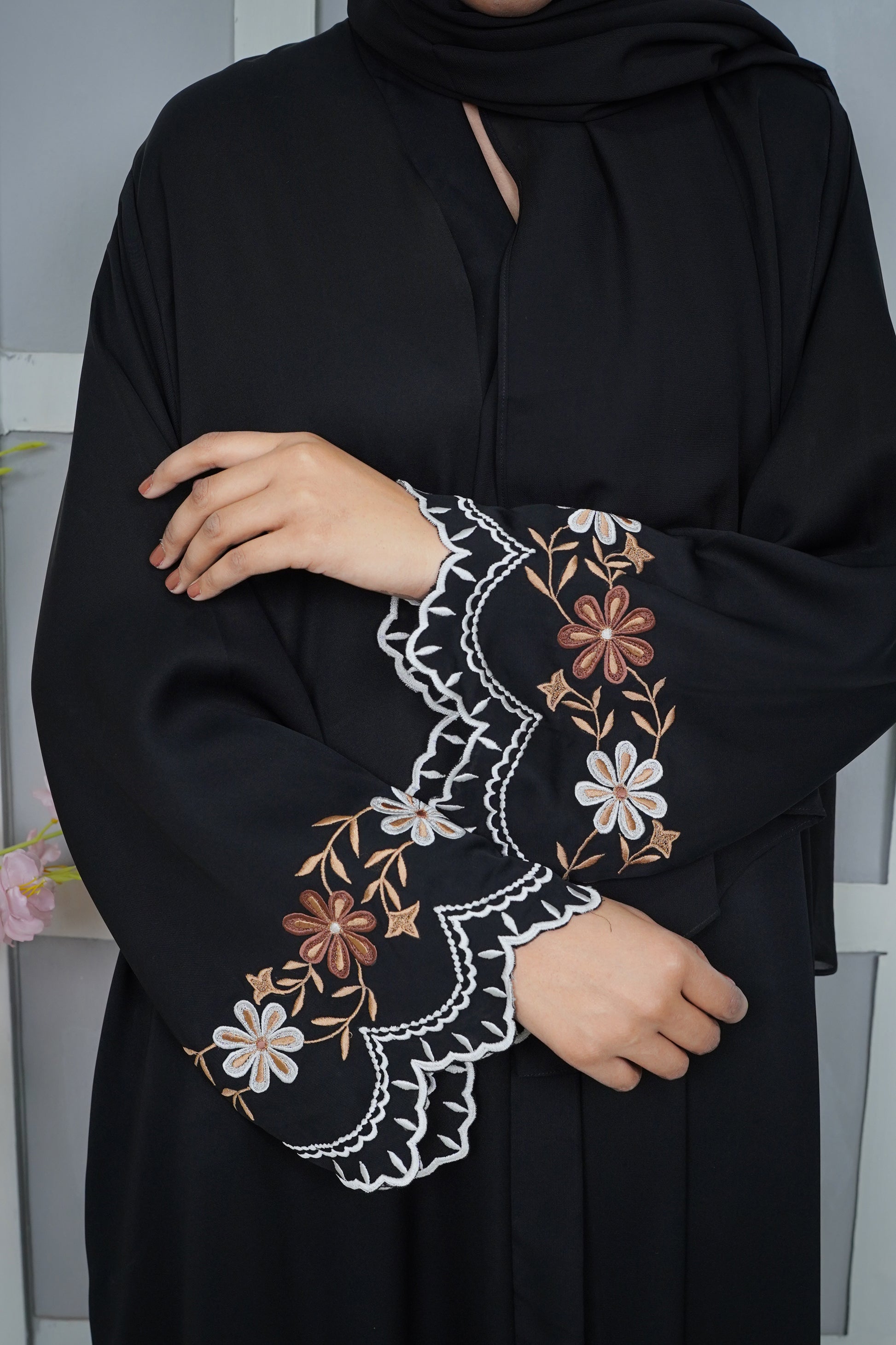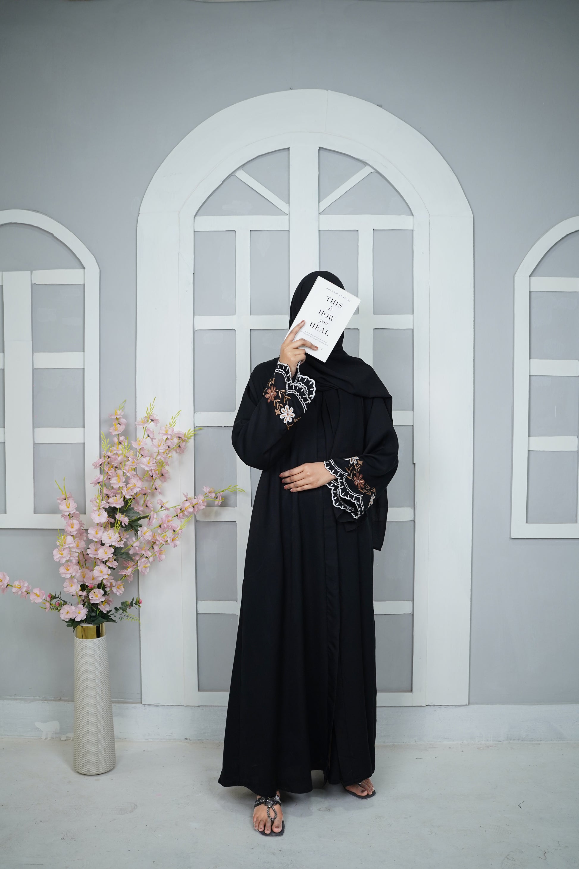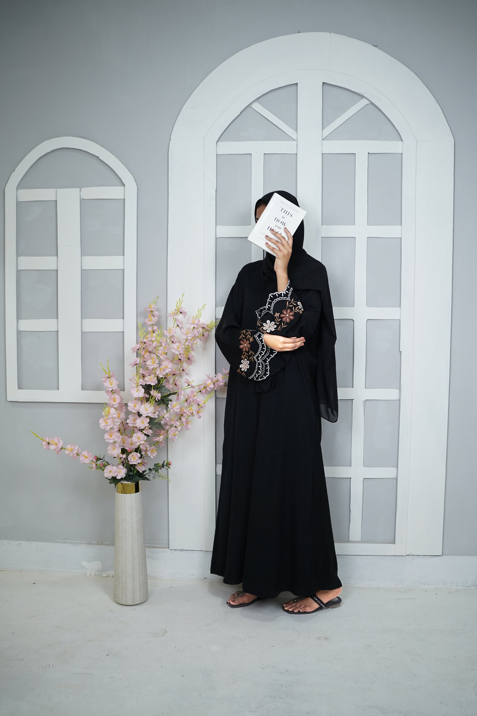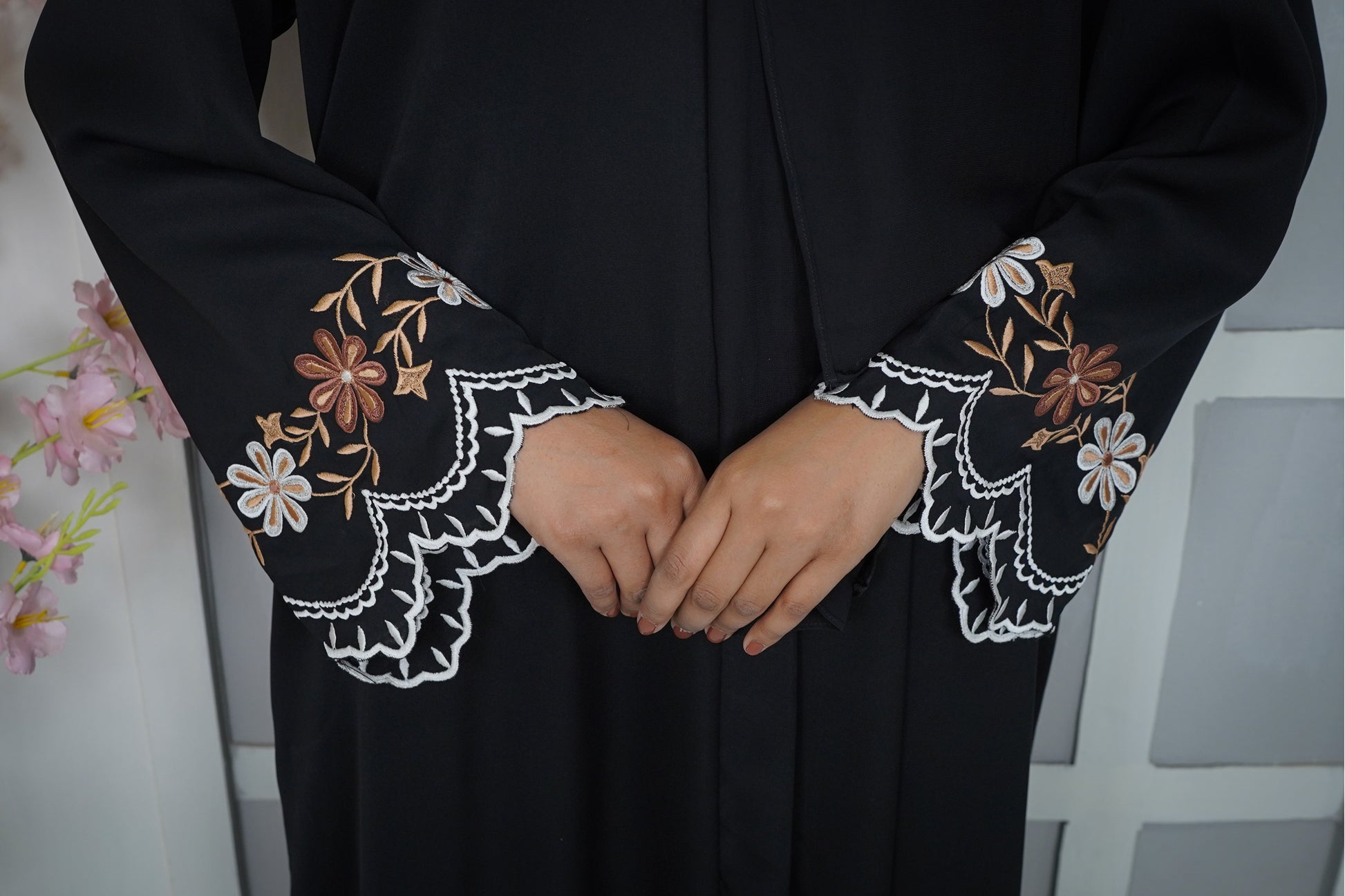 Step into timeless elegance with Velmira Noir, a beautifully crafted black abaya designed to reflect sophistication and grace. This stunning piece features intricate floral embroidery on the sleeves, enhanced with delicate scalloped organza cuffs that add a refined feminine charm.