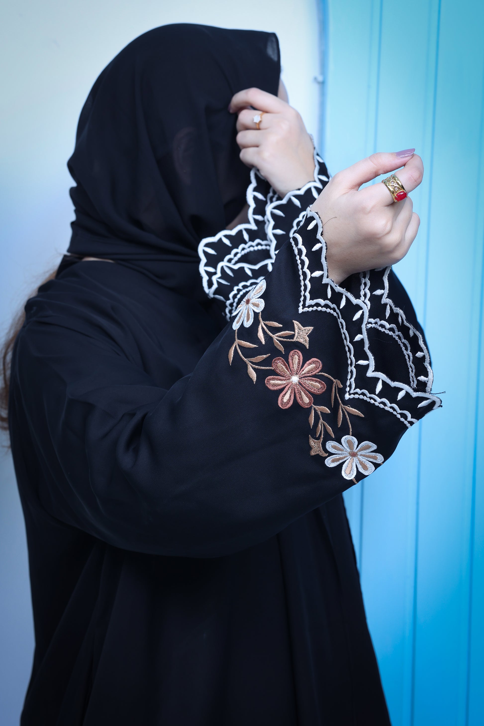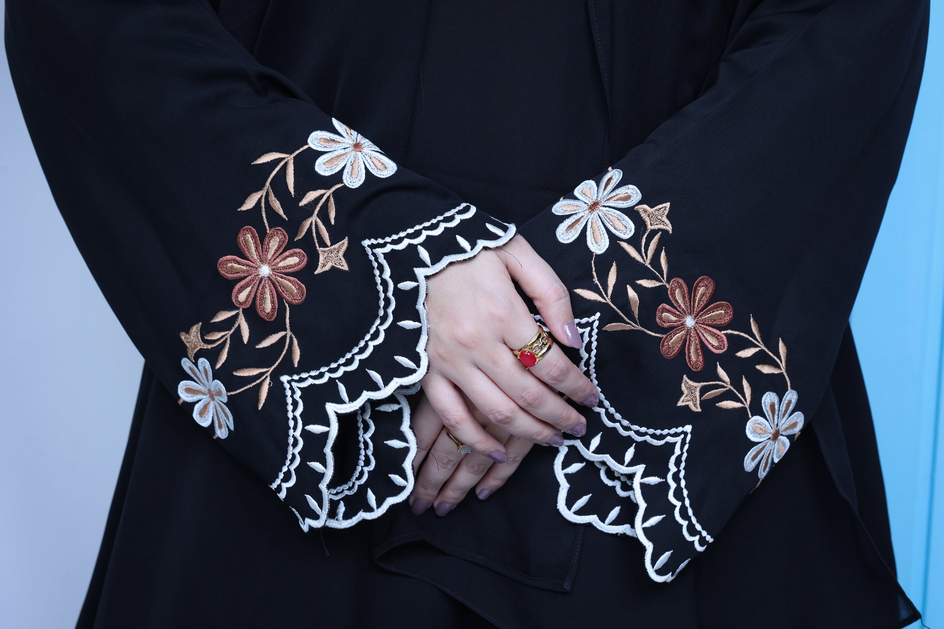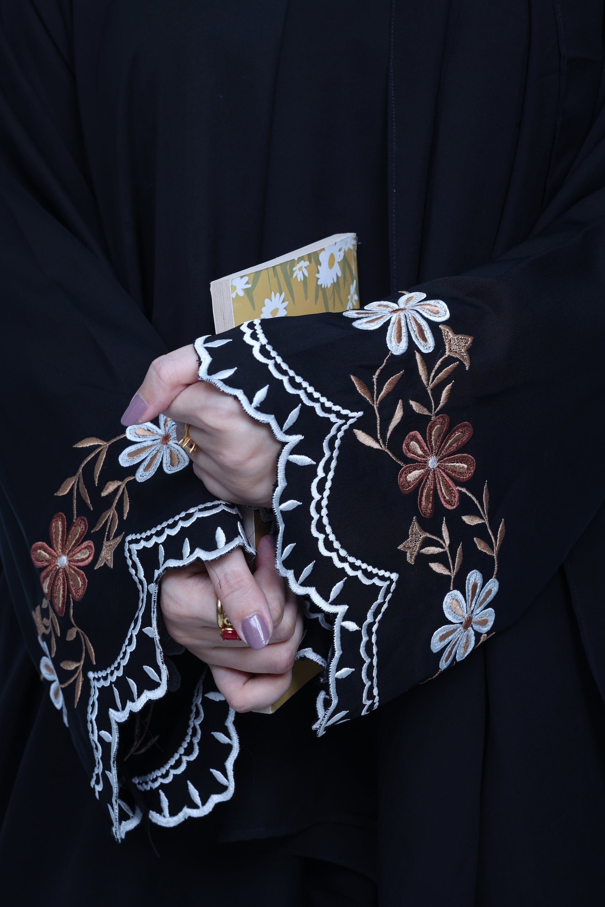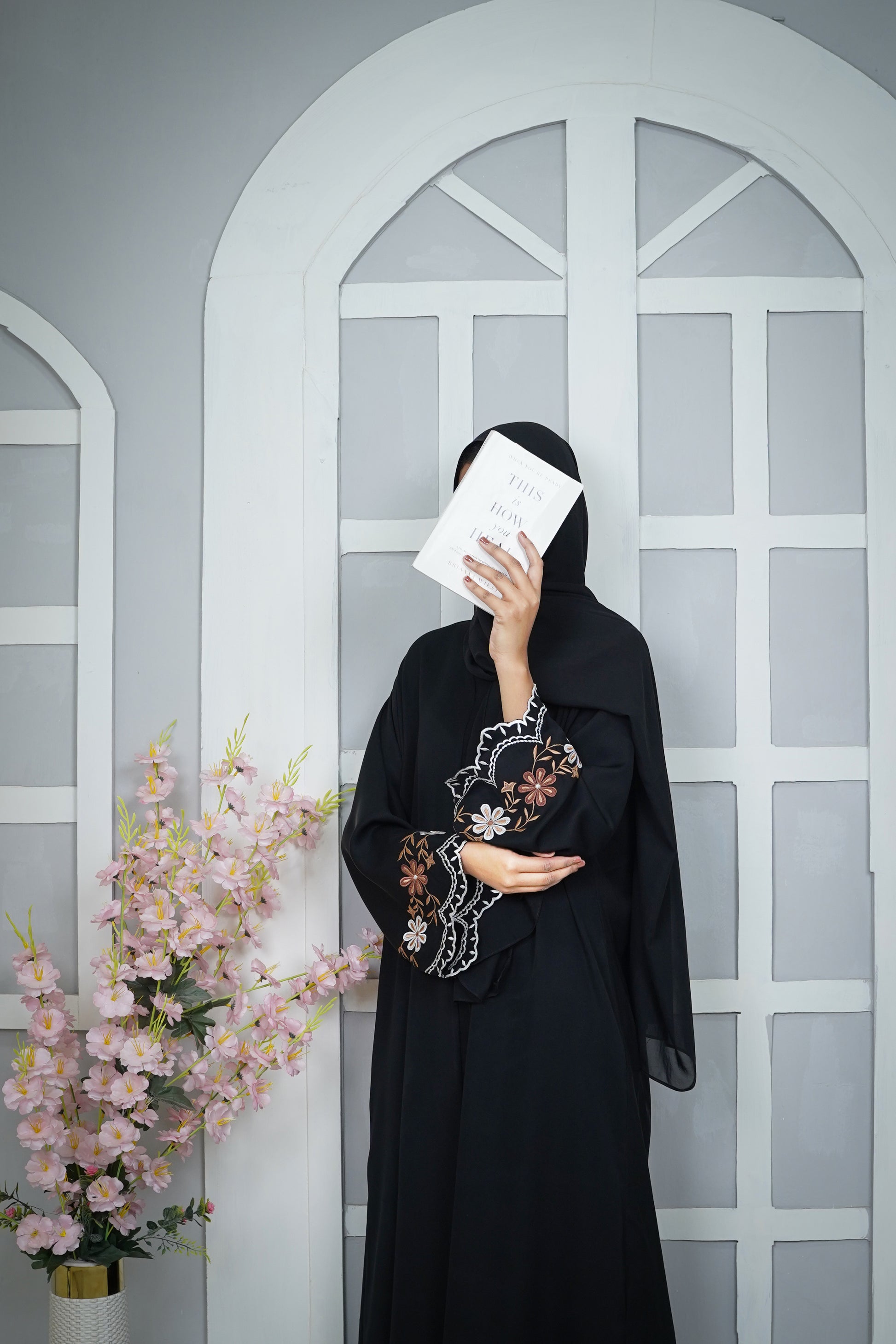 Step into timeless elegance with Velmira Noir, a beautifully crafted black abaya designed to reflect sophistication and grace. This stunning piece features intricate floral embroidery on the sleeves, enhanced with delicate scalloped organza cuffs that add a refined feminine charm.
