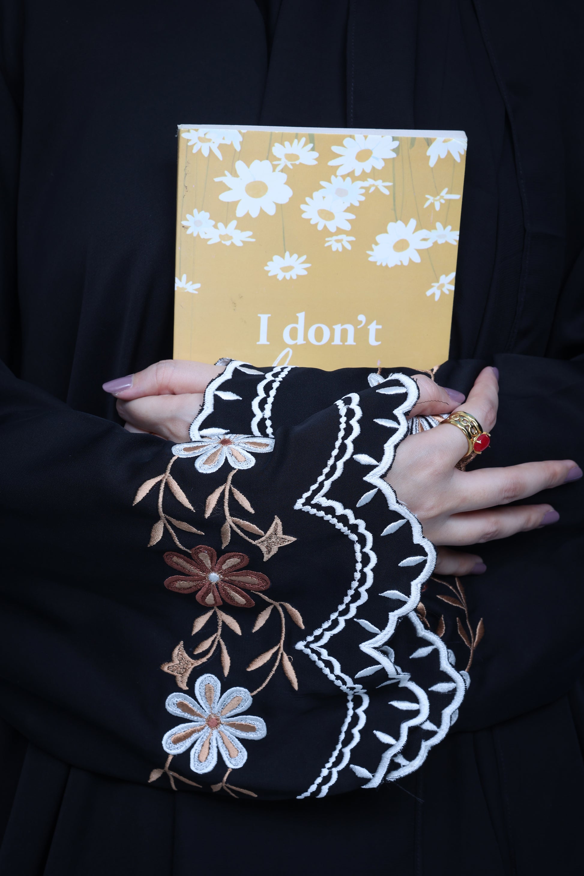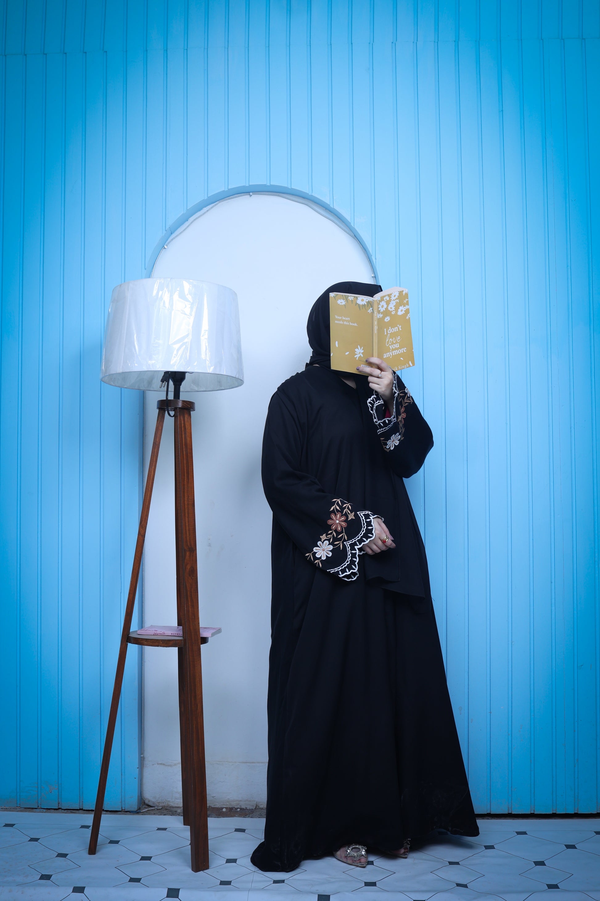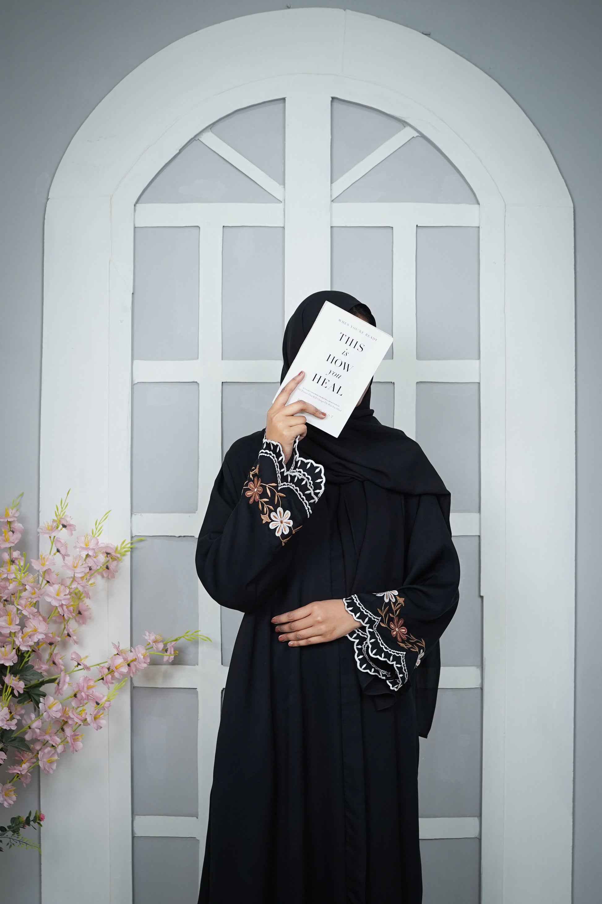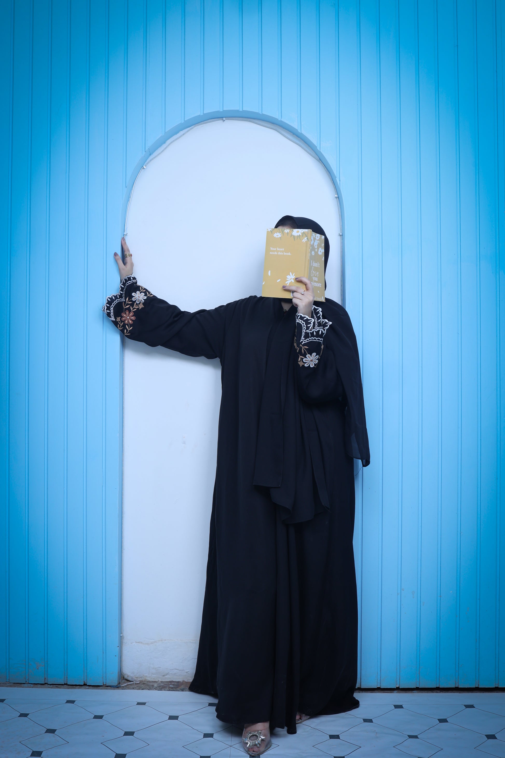 Step into timeless elegance with Velmira Noir, a beautifully crafted black abaya designed to reflect sophistication and grace. This stunning piece features intricate floral embroidery on the sleeves, enhanced with delicate scalloped organza cuffs that add a refined feminine charm.